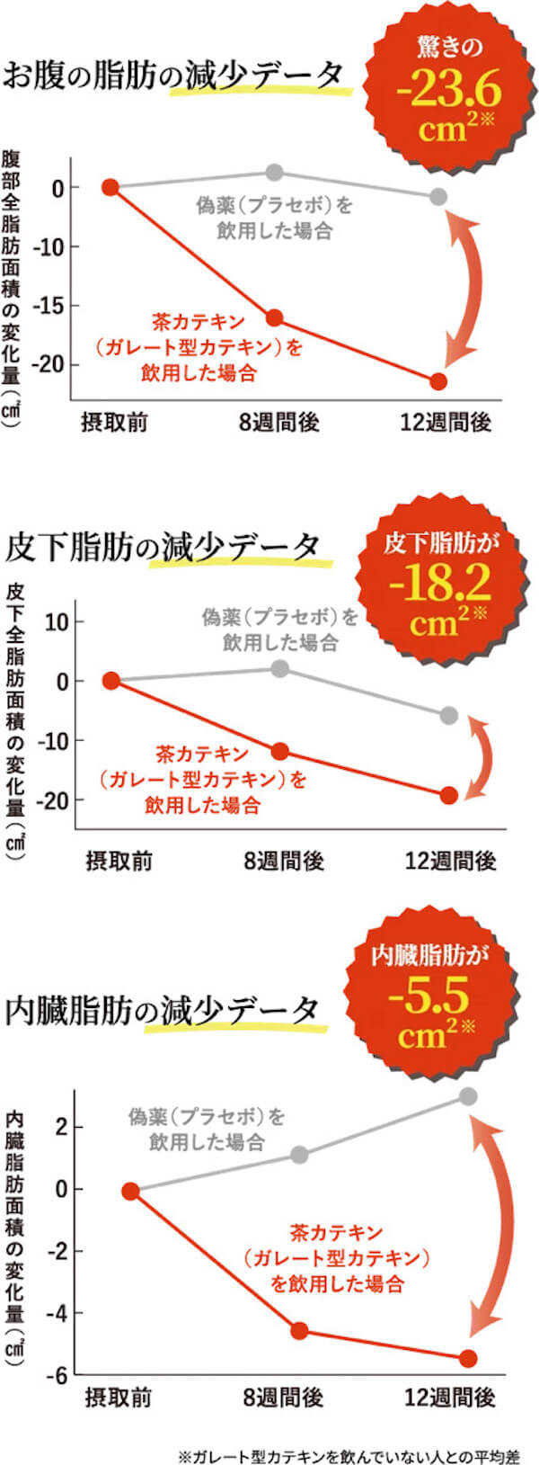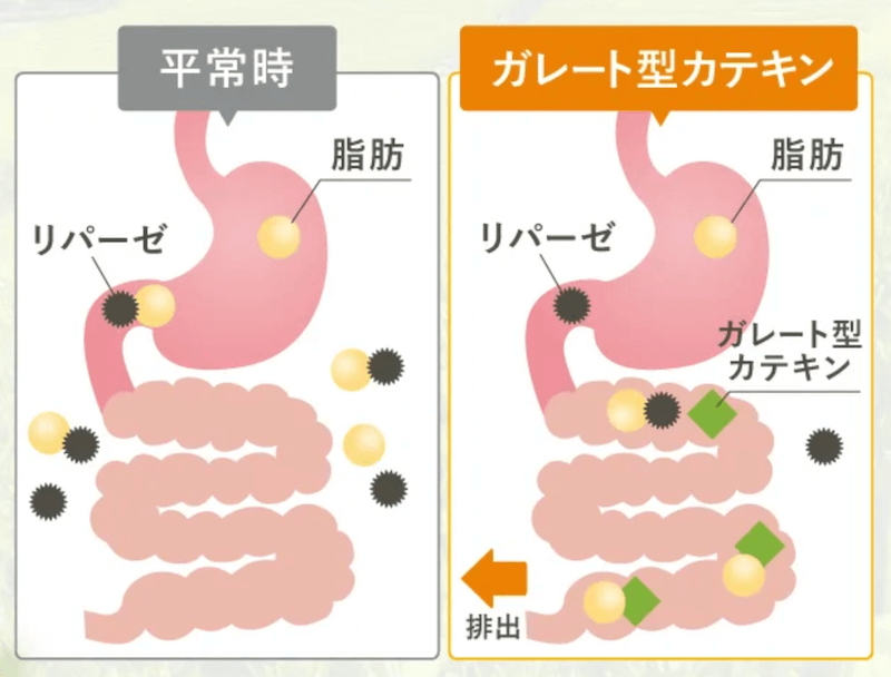 普通は食べた分だけ吸収しますが、ガレート型カテキンは食べた一部を体外に排出するから脂肪を減らす事が可能になりました。