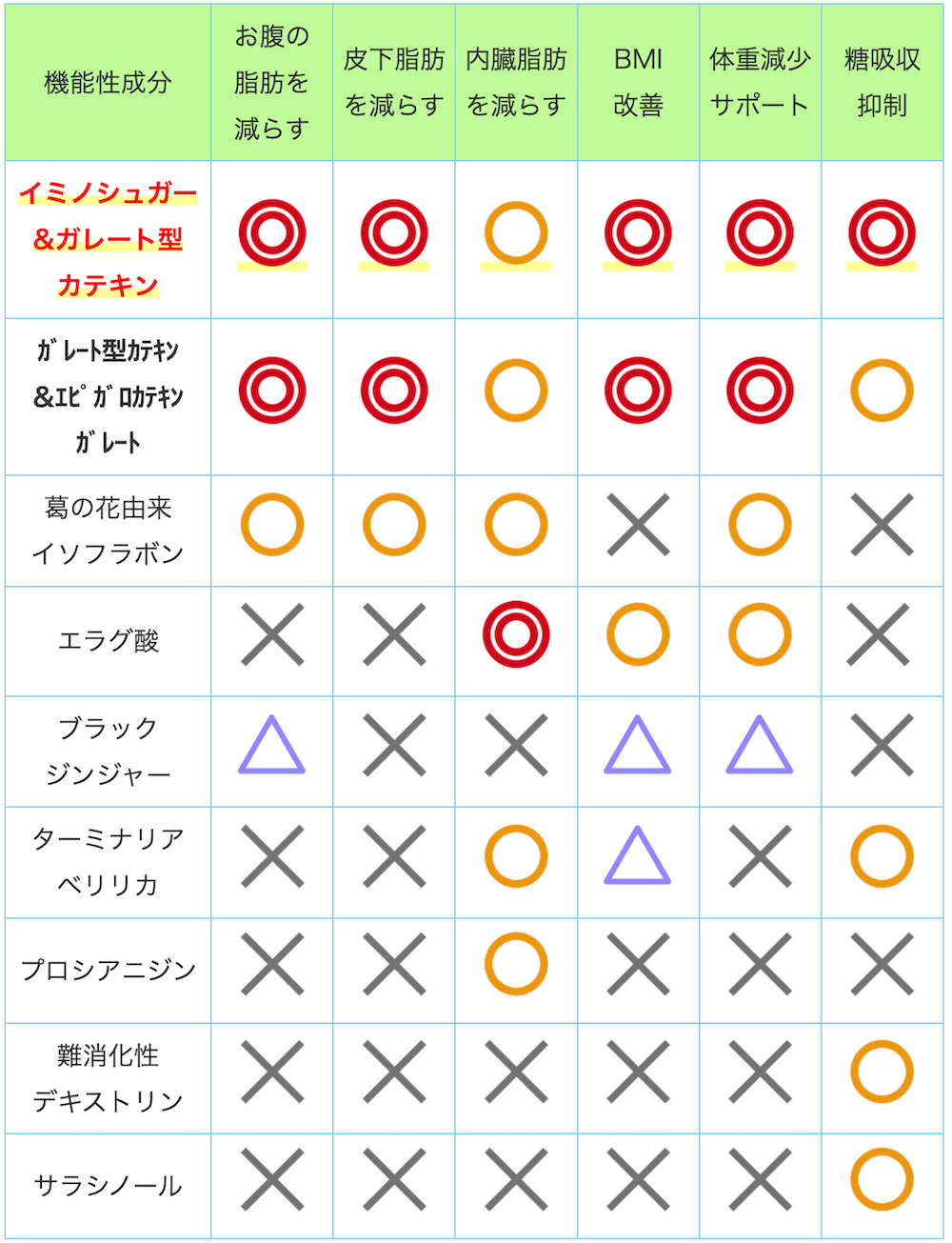 見比べてみると、主成分が唯一イミノシュガー&ガレート型カテキンである桑の葉&茶カテキンの恵みが圧倒的に優れている事が分かりやすいですよね。