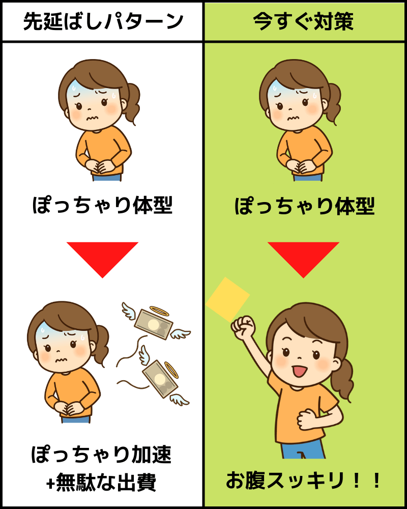 憎き腹回りの脂肪をスッキリさせるためには、1日でも早く行動するのがおすすめです。